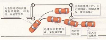 1、车身在车库的左侧,右轮沿着库左边线行驶,车轮距左边线50cm(从座位上看,桑塔纳一般在车后侧机盖1/3的位置压线),行驶到库上边线以前50cm处停车。
