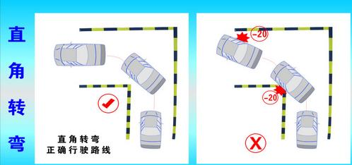 简单来说就是,进入直角转弯区,要使车辆右侧与路边线保持在30厘米的距离,正确把握距离非常关键,若距离过近容易造成车右侧轧线,若距离过远,不能有效地利用路面的宽度,则造成操作失败。前进时当视线所观察到的车辆的最前端与前路边线重合时,便可迅速将方向盘向左转到底,等到车身完全转过,车头正直后迅速将方向回正,直角转弯结束。