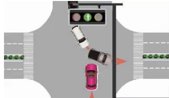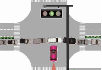 3、绿灯情况下的直行红车,没有让上一个红绿灯期间内遗留在路口中间的对面路口开过来的左转弯车辆先走。