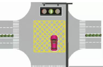 2、前方处于绿灯状态,将车停在路口画有黄色网格线(禁止停车区)范围内的。