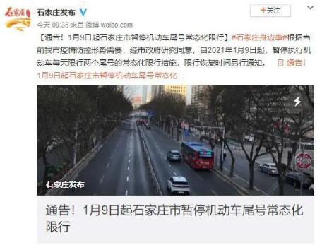 经石家庄市政府研究同意,自2021年1月9日起,暂停执行机动车每天限行两个尾号的常态化限行措施,限行恢复时间另行通知。