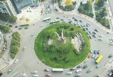 假如车辆要直行,则应该选择环岛内中间车道。由于车辆进入环岛后不需要变换车道,因此车辆进入环岛时不需要打左转向灯;当车辆准备出环岛继续直行时,由于要跨越环岛内右侧车道,因此需要打右转向灯提示其他车辆注意,然后驶出环岛。