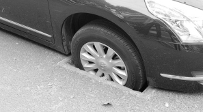 车轮掉进井盖中