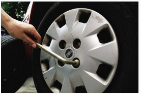 别一上来就把千斤顶先弄上,一定先要用螺丝扳手送送螺丝(是拧松,不是卸下!),注意,在松螺丝的时候,要采取对角线逐个拧松的方法,因为这样才不会使得螺丝、轮胎、轮毂变型!