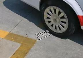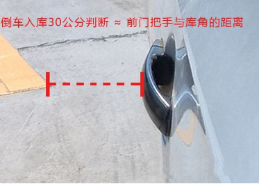 通过后视镜判断车身与库角 30公分,约等于“库角角尖与前门把手30公分”,必须清楚的知道参照点位是哪里,这一点十分重要。