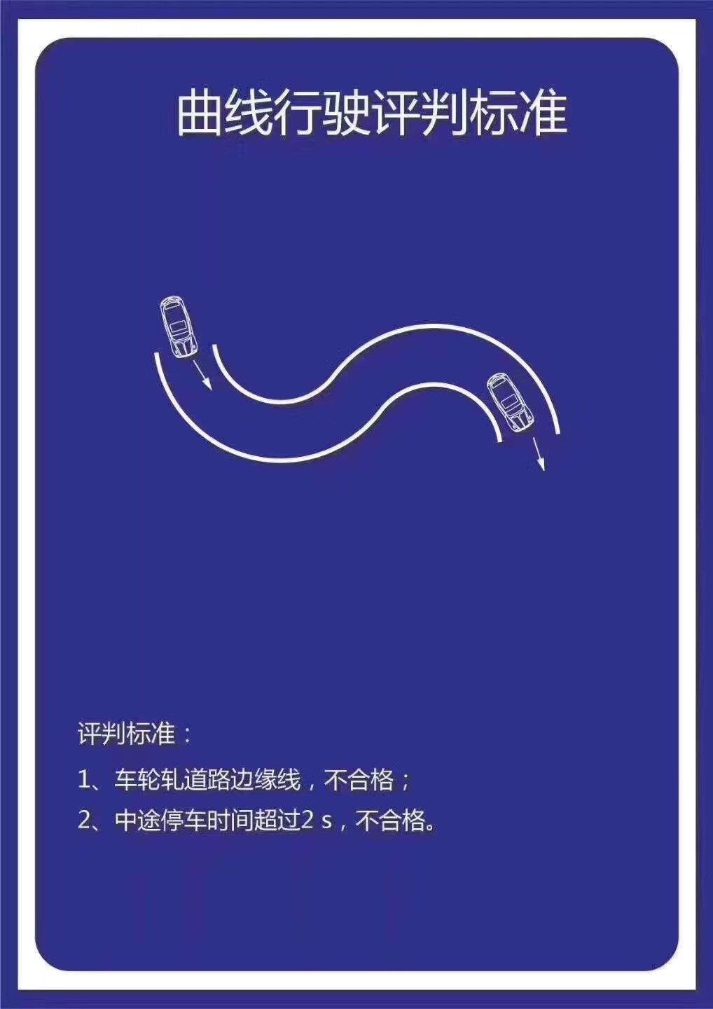 考试要求:学员应驾驶车辆从弯道的一端前进驶入,以2档及以上挡位从另一端驶出。行驶中转向自如,车轮不得触轧弯道边缘线,中途不得停车。