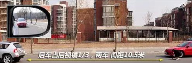 当后车充满后视镜的1/3时,两车间距10.5米,在日常行车时基本算是比较安全的距离,不过在高速公路或车速较快的环境下,并线还是要格外小心。