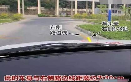 当看到黄线的头到车子的车栓的时候,迅速的向右打一盘子,速度自己掌握,这个看自己踩离合控制车速的快慢决定的。