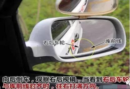 倒车:打右转向灯,挂倒挡,缓慢抬离合,当车子走动时左脚保持不动。观察右后视镜,当看到右后轮与前库线对齐时,往右打满方向。