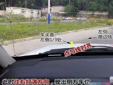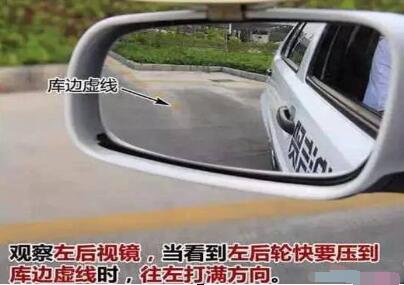 然后观察左后轮,等到左后轮即将压到库边虚线时,往左打满方向,同时观察车身左右两侧库边线的角度,调整回方向的速度。