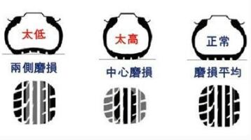现今各种轿车,在用户手册上部会注明该车轮胎气压要求,允许的偏差也就是上下0.1-0.2公斤压力(一、二百个千帕单位)。很多车主往往随意打气,甚至用脚踢来试试气足不足。这是危险的,因为轮胎在工作情况中致命的因素是发热。一辆以100公里时速行驶的车辆,胎面温度(最热的地方是在胎肩,即胎面与胎侧交接处)可达到70°C左右(烫手)。从轮胎结构讲,有三个地方吃力最重:即胎肩,胎侧以及胎圈。轮胎充完气以后是鼓起的,但其与地面接触部分却是平的。