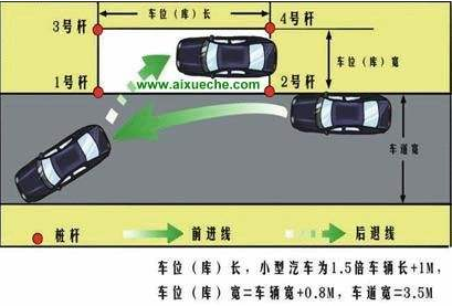 二.摆车:用半联动起步,有把握也可以适当加油。起步要遵循一踩,二挂,三转向,四鸣笛,五瞭望的原则,并把车平行停在离库30-50厘米的位置,车尾要过最前方的杆。
