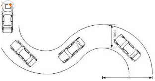 2、进入第一个弯道,车辆沿道路的右侧进入弯道(距左侧路边缘约1米),保持匀低速行驶,向左打方向盘,车辆由靠右侧行驶变为靠左侧行驶。