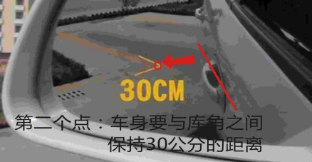 第二个点:当打死方向向后倒车时,把目光转移到右后视镜上,看右车身与库角之间的距离,目测是否有30公分的距离,如果小于30公分回半圈方向,继续后倒,直至车身与库线平行,回正方向。如果大于30公分了,说明你在起点位置方向打晚了。