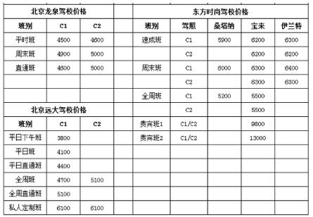 从以上北京驾校价格表数据我们可以看到,C1手动档驾照的最低报价是北京远大驾校的平日下午班,3800元,虽然价格低,但培训时间是在周一至周五的下午和晚上,在上班的白领们肯定不方便,但如果是大三、大四的学生,空闲时间比较多,可以优先考虑这类的教学班。