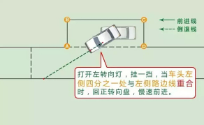 练习技巧:没有了标杆作为参照物,要学会使用后视镜辨认标线。将方向盘向右打到极限,往后倒车,看车左边后视镜,后门把手应距黄色标线3厘米左右。方向盘回正,汽车往后倒车,行进途中方向盘向左急打,而后正常打转向灯驶出黄色方框标线即可。