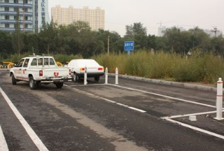 当车子的首部与1号杆齐平时,立刻将方向盘向左打足(使车头进入停车位置);