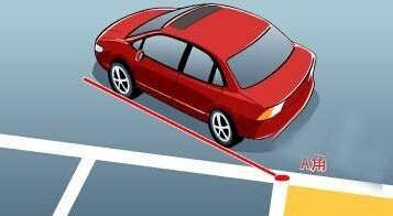 第二步,在车辆停稳后,将方向盘向左打到底,在保证安全的情况下慢慢后退,使车身的左边线对准图上A点,然后停车。