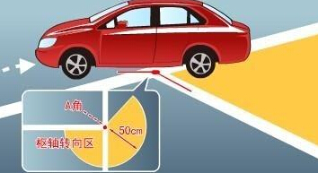 第四步,在停车状态下继续将方向盘向左打到底,慢慢倒车约50cm后停车,这时左后轮的中心停在图中标注为“枢轴转向区”的外缘上。