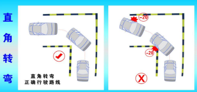 注意要调整右后视镜位置,尽量压低,能侧身看到右后胎为好;车子即将进入直角弯时尽量放慢速度;左雨刷器支点贴着直角弯左线前行,这个点根据每个人的位置、身材不同,会有差异,主要是为了保证左轮胎与直角弯左线的距离在15——20公分,并且保证车身正。