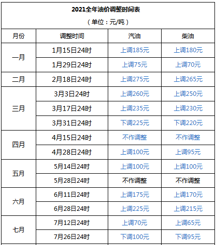 2021年油价调整时间表一览表