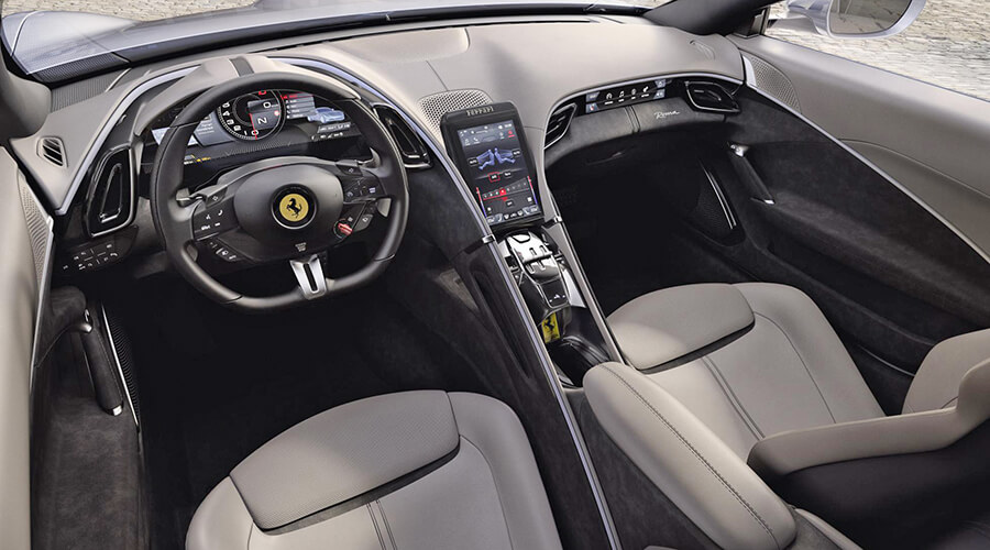 车厢方面,整个设计与其他法拉利明显不同。从相片可见Roma用了相信与SF90 Stradale同款的軚盘。中间的屏幕似乎面积也不小,与电子表板及副驾驶座前的屏幕加起来,一共有三块电子屏幕。