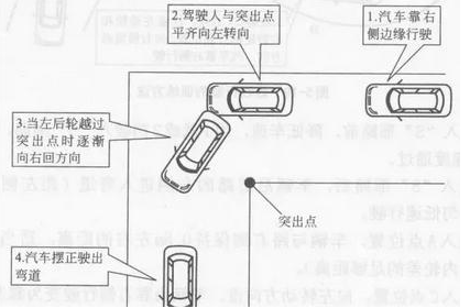 四、进入直角前,让车在路两边内尽量远离转弯点的标志杆向前慢速行驶;当靠近转弯点一侧的前窗上小三角窗中心与转弯点重合时,向转弯点一侧大方向到底,通过后车头正时回正方向。