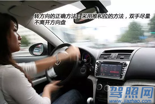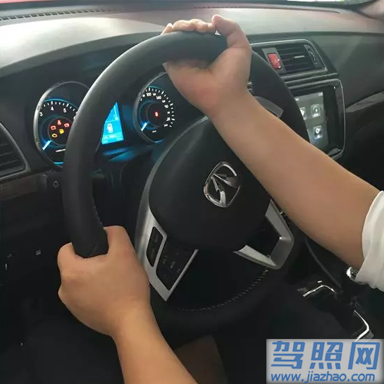 左手握在9点钟方向,右手握在3点钟方向,拇指自然搭放在方向盘两侧,在打方向,超过半圈的时候,我们需要换手来完成方向的扭转。
