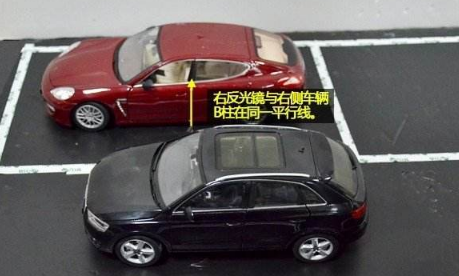 找到了合适的起始位置,就可以开始倒车了,此时将方向向右侧打满,当车头与旁车成45度角时将方向回正。往往作为驾驶员很难从车内视角中判断出是否达到45度,这里介绍一个小技巧,当你观察右侧后视镜的外侧与旁车B柱即将重叠,从左侧后视镜可以看见完整的后车,此时基本处于45度的车辆状态,方向可以回正了。