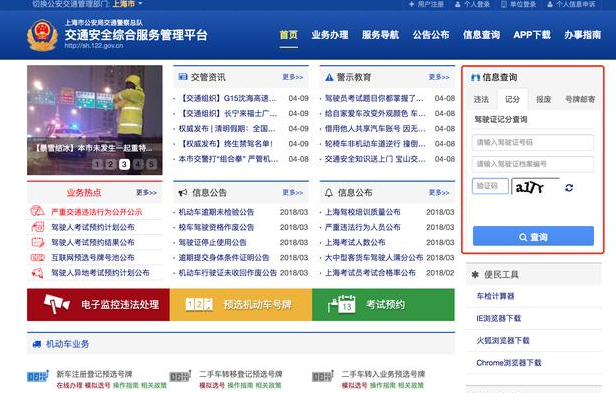 b)在右侧的信息查询中,点击“记分”,并填写驾驶证号码、驾驶证档案编号及验证码,输入完整信息,点击查询即可查个人驾驶证扣分情况。