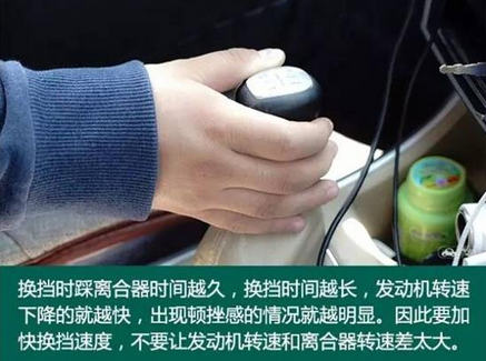 当换挡松油门、踩离合时,发动机失去动力,转速下降的比较快,但由于车速并没有下降,所以此时负责传动离合器片转速并没有下降太多。因此要加快换挡速度,不要让发动机转速和离合器转速差太大。