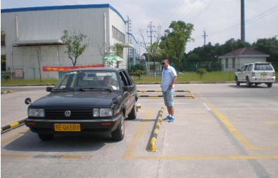 挂上一档要出库,车头触线左打足。