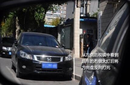 然后向右打死方向盘,慢慢往后倒车,注意要从右后视镜中观察车尾部分与旁边车辆的间隔,如果不够要重新调整。接着从左侧后视镜中看到后车的右侧大灯后将方向盘往左打死。