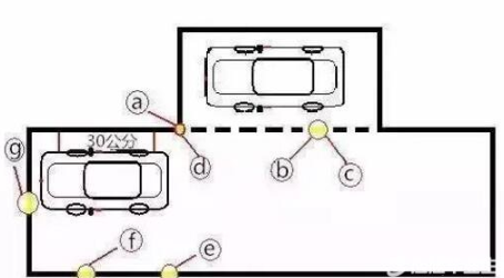 7、继续前进,当车行正后,车头碰到g点时,回正。