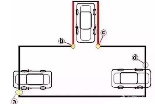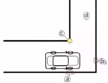 4、平行入库后,回正方向,当车左镜盖住c点时刹车停车。