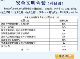 科目四考试是从题库中抽取50题作为考题。总分100分,90分合格。考试题类型采用情景判断、事故案例分析等形式,考试内容包括安全驾驶常识、驾驶职业道德、恶劣条件驾驶、紧急情况避险和事故救护等知识。考试题库全国统一,各总队要结合本地交通安全形势和交通事故特点,增加10%的地方题库。结合重特大道路交通事故暴露出的问题和不同时期交通违法行为的变化情况,及时调整、更新考试题库。