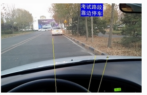 5、向左回转方向(第三把轮,车正轮正)迅速停车。在车辆近停时,稍许抬起制动踏板减缓刹车惯性,平稳停车。