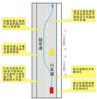 由于超车需要借道,因此超车前一定要先观察所要借用车道的状况,这时候可以利用并线的技巧,安全并入旁边车道。除了观察旁边车道的车辆行驶状况,还要观察所要超的车前面的车辆行驶状况。