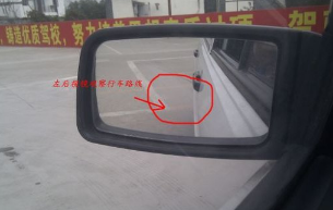 从右后视镜里见到整条右边线刚刚出现后,马上回直方向盘。继续观察左后视镜,拉直车身;当右门把手(蓝点标记)与车库底线水平即停。