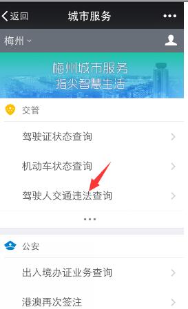 2、在城市服务中,我们就可以看到交管中的驾驶人交通违法查询功能,点击后,输入自己的先关信息即可查询。