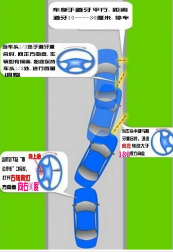 第四步:当车身与马路牙子平行时,距离马路牙子10到30厘米处,停车。