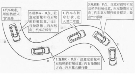 1、进人“S”形路前,降低车速,用1挡或2挡驶人“S”形路,选择恰当的路线及速度通过。