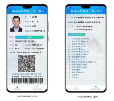 电子驾驶证由正页和副页两部分组成。其中,正页主要包括驾驶证基本信息、电子证生成时间、用于验证信息的二维码和一维码等内容;副页主要包括驾驶人住址、发证机关、驾驶记录以及准驾车型代号规定等内容。其样式如下: