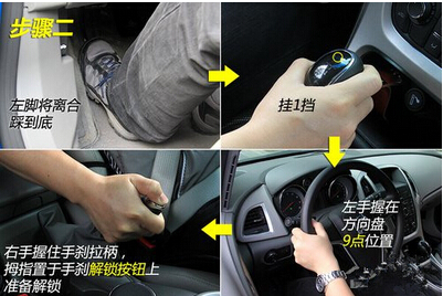 2.左脚将离合踩到底,挂一档,左手我在方向盘9点位置,右手握住手刹拉柄,拇指置于手刹解锁按钮上,准备解锁。