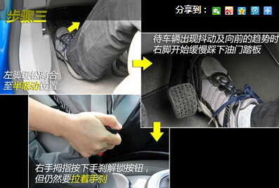 步骤三需要注意的是,左脚缓松离合踏板至车辆出现抖动时,应稍稍固定在这个位置,确认车辆是否具备向前的趋势和动力,而不要继续将离合踏板抬起,以防熄火;当车辆向前走时,右手才将手刹彻底放下。