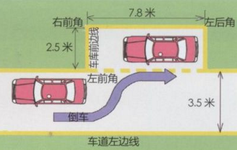 ①车辆在库前方靠右停稳后,一次倒车入库。