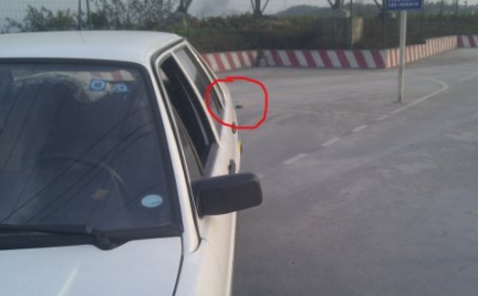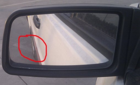 在车上观察,右后视镜正好看到库前线在后视镜下沿(学员需要学会调整后视镜);