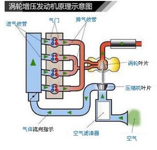 增压涡轮发动机的增压装置并不复杂,由涡轮室和增压器两部分组成。涡轮室的进气口与发动机排气歧管相连,排气口则接在排气管上。增压器的进气口与空气滤清器管道相连,排气口接在进气歧管上,最后涡轮和叶轮分别装在涡轮室和增压器内,二者同轴刚性联接。