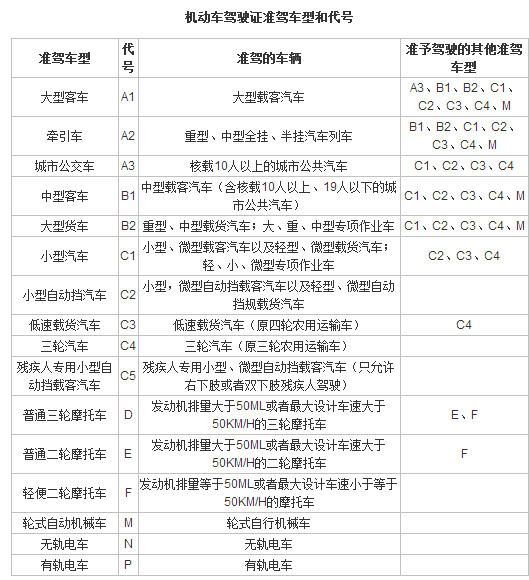 即将考驾驶证的您想过没,什么样的车考什么样的证,有的人对此可能很模糊,只知道自己要考驾照,可不知道驾照也是随着所开车型的不同而决定驾照的不同的,特此搜集了各类驾照对应准驾车型及代号供各位参考。