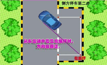 第二步,看到左后视镜与库位白线平行后,直行入库。